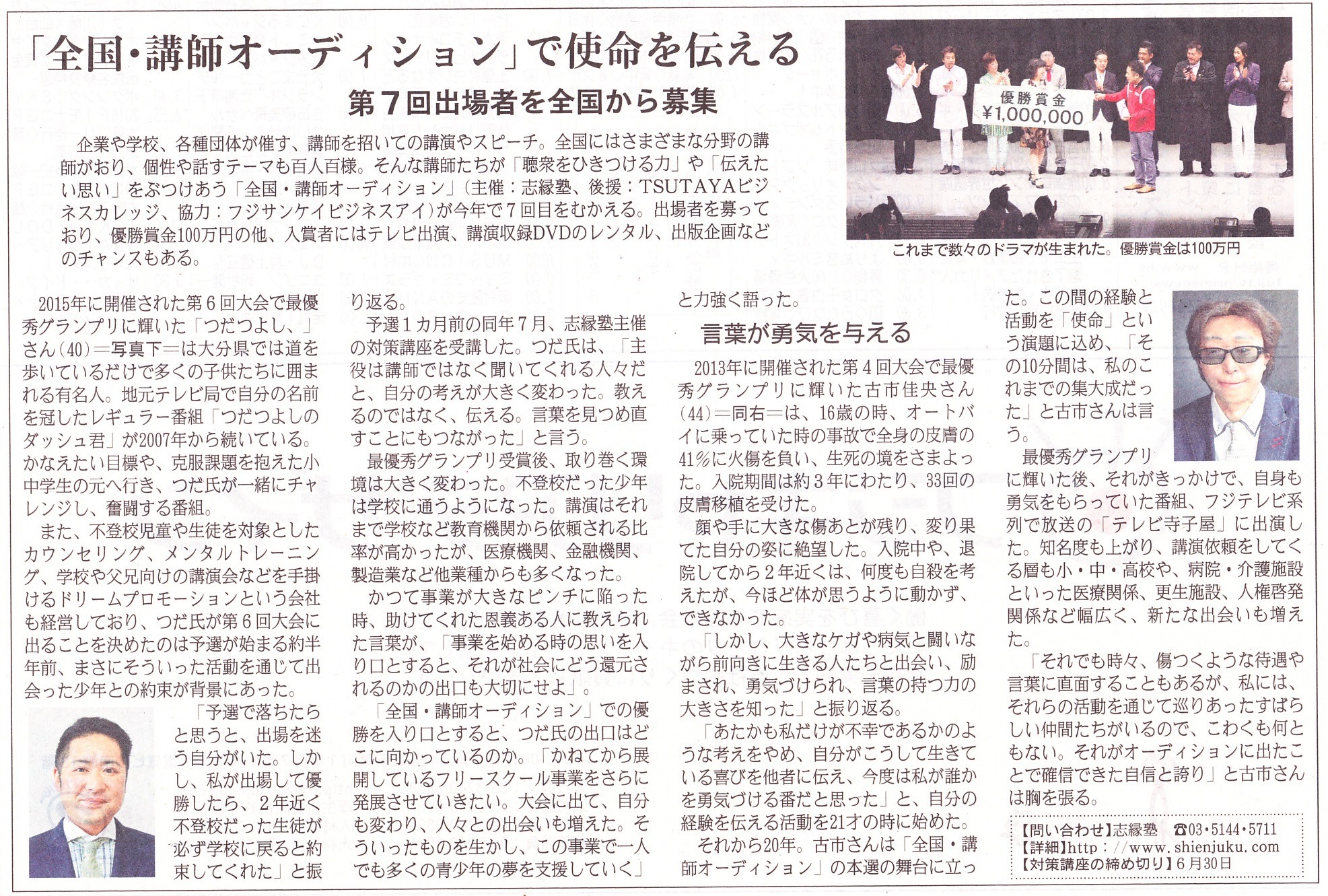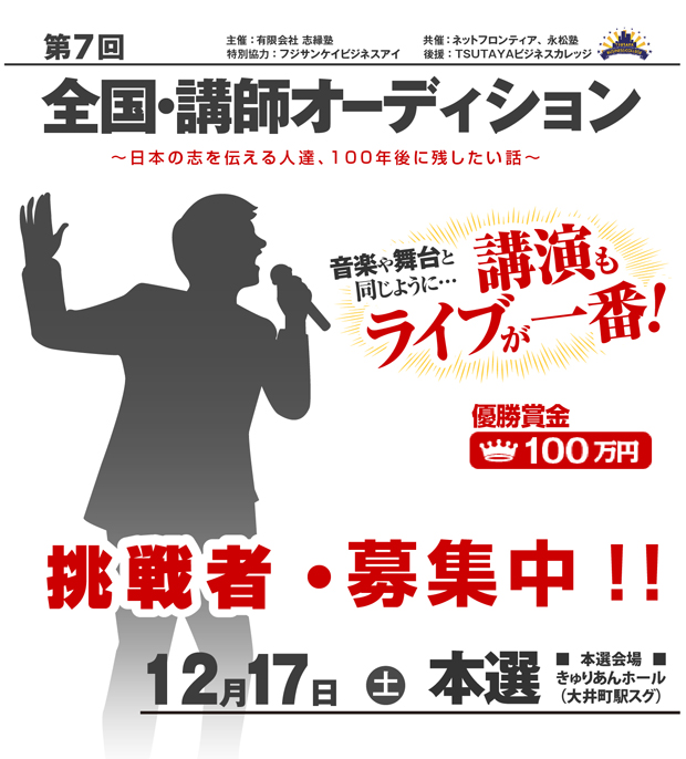 優勝賞金100万円の「全国・講師オーディション」を開催。